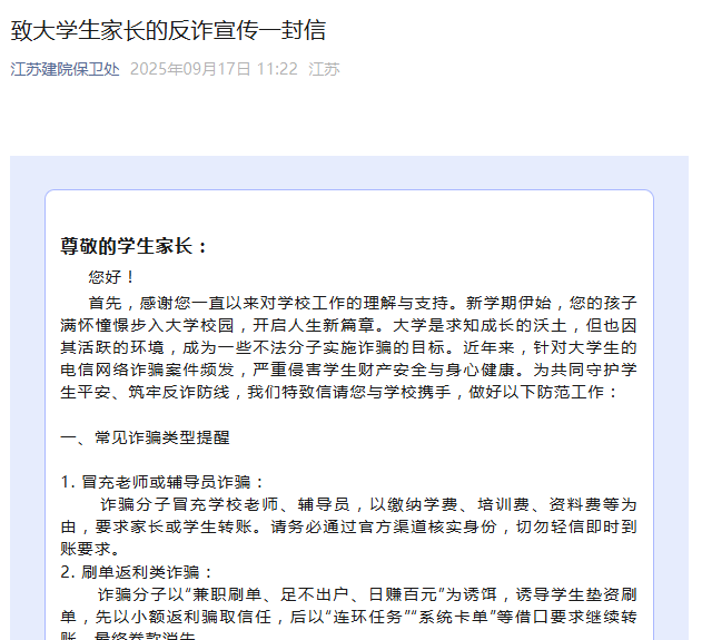 在宣传方式上,采取了线上线下相结合的模式。线下宣传方面,在主要教学区精心布置了反诈主题展板,并在教学楼宇电子显示屏循环播放反诈宣传视频。线上宣传方面,通过官方微信公众号平台推送反诈知识,同时通过公众号平台向学生家长发布《致大学生家长的反诈宣传一封信》,构建起家校协同的反诈防线。