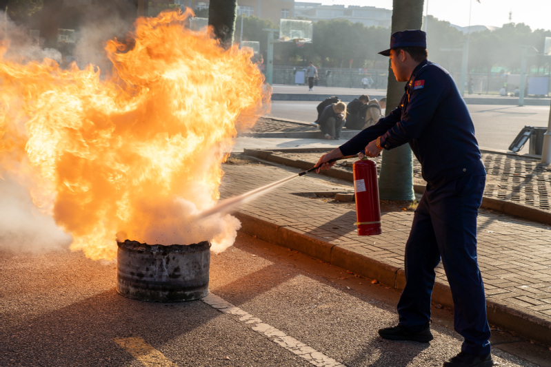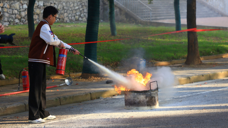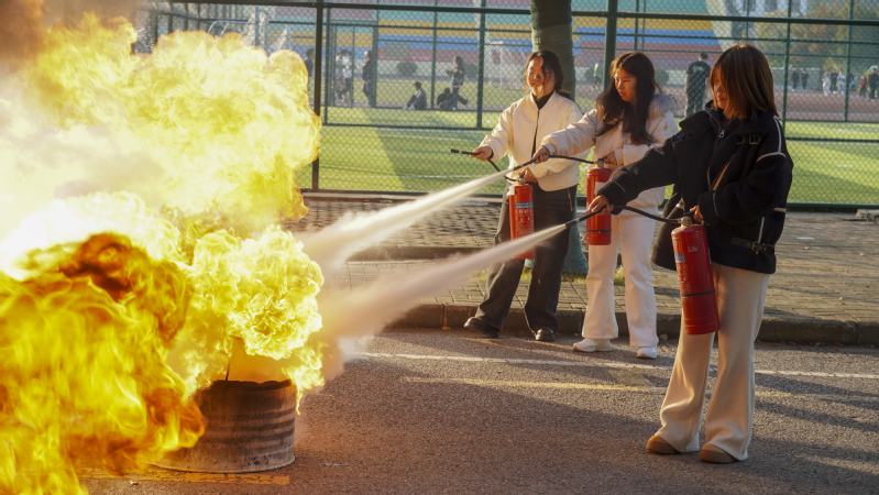 随后,新生代表在消防队员和保卫处工作人员的指导下,分批进行了灭火器实操演练。面对模拟火源,同学们沉着冷静,按照刚刚学到的知识,成功将火焰扑灭,亲身体验了初期火灾的扑救过程,掌握了基本的灭火技能。