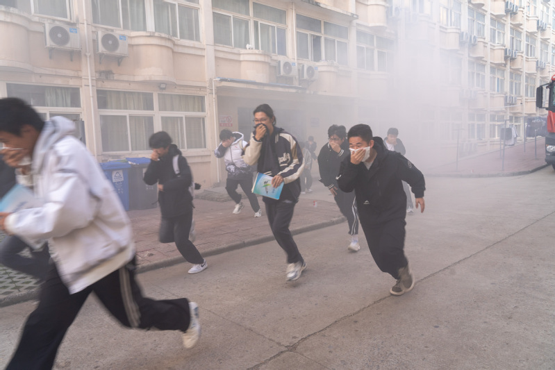 随着各项准备工作的全面落实,演练活动正式进入实战阶段,演练当天下午15:30,随着现场总指挥--保卫处处长孙浩一声令下:“2025级新生应急疏散及灭火演练现在开始!”,演练正式拉开帷幕。模拟火情信号发出后,新生宿舍楼内烟雾弥漫,新生们在老师及工作人员的指引下,迅速反应,用湿毛巾捂住口鼻,弯腰低姿,沿着预定疏散路线快速、有序地向指定安全区域撤离。整个疏散过程紧张有序。